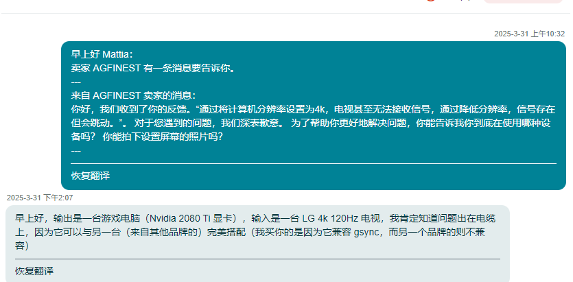 李秀莲 2025-04-03 回复- 用户反馈连接LG C2 和 rtx 4080 无法在 4K分辨率下达到 120Hz。4K下的最高频率只有 60HZ。
